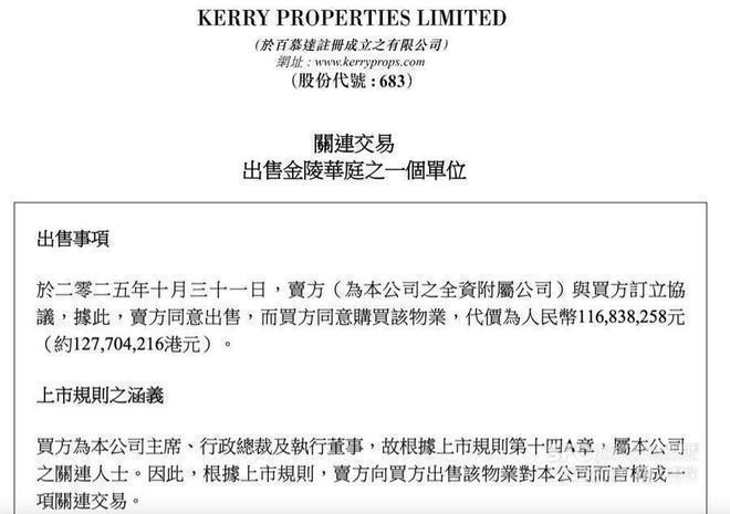 10月31日,嘉里建设发布关联交易公告称,公司主席、行政总裁及执行董事郭孔华(嘉里建设创始人之子),金陵华庭售楼处电线亿港元)向公司全资附属公司上海卓妙置业购置上海金陵华庭项目第二座一套四房单位。该房源建筑面积约449平方米,尚处于建设阶段,交易完成后集团预计录得约2300万元收益,所得款项将用于集团一般营运资金。